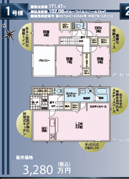 | 詳細間取 | 1階 LDK22帖 2階 洋:6帖 洋:7帖 洋:5帖 DEN:3帖 | 完成年月 | 2026年2月 |